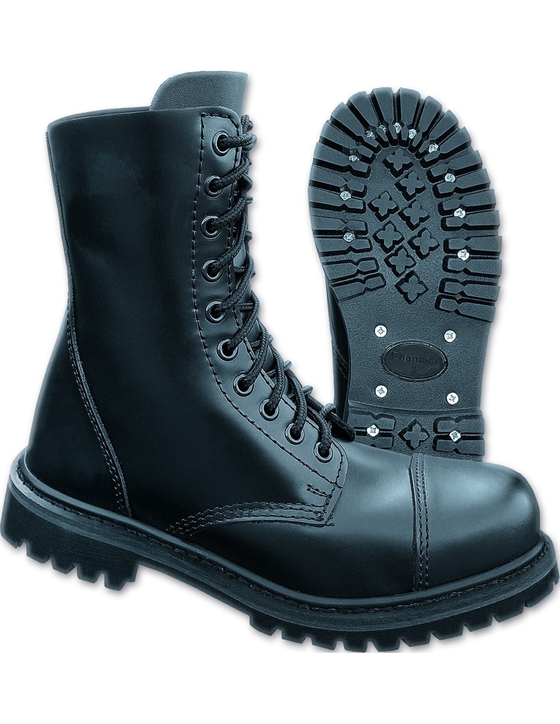 Anfibi Brandit Phantom antistatici 10 buchi. Realizzati al 100% in vera pelle. Robusta suola fissata con viti, come da foto. Modello con 10 buchi per lato per i passanti dei lacci. Tomaia in pelle e tallone rinforzato Linguetta in pelle cucita. Suola in gomma. Ottimo rapporto qualità prezzo. Vestibilità abbondante. Ordinare 1 numero inferiore rispetto a quello indossato abitualmente.