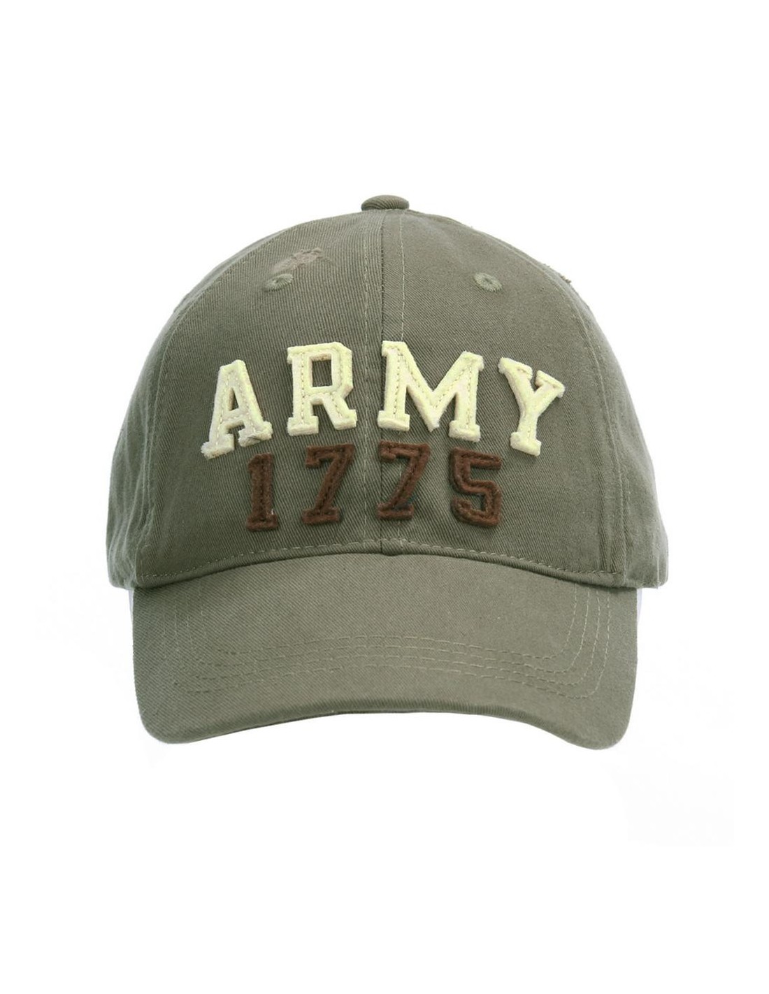 Cappellino da baseball con scritta Army 1775 ricamata frontalmente in rilievo, di due colori.