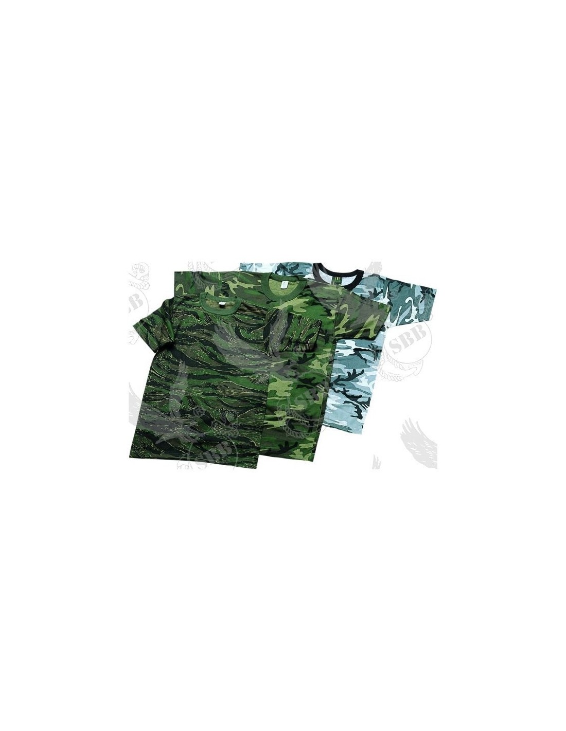 Maglietta T-Shirt mimetica Camo Il colore disponibile è il woodland (la maglia in mezzo) Made in U.S.A. Mimetismo: Woodland. Taglie disponibili: S - M Materiale: Taglia S 50% cotone/50% Polyestere Taglia M 100% cotone